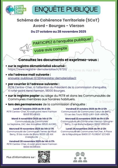 Le projet de SCoT Avord-Bourges-Vierzon arrêté par le comité syndical du PETR Centre-Cher le 18 juin dernier donnera lieu à une enquête publique qui aura lieu du 27 octobre au 28 novembre prochain.