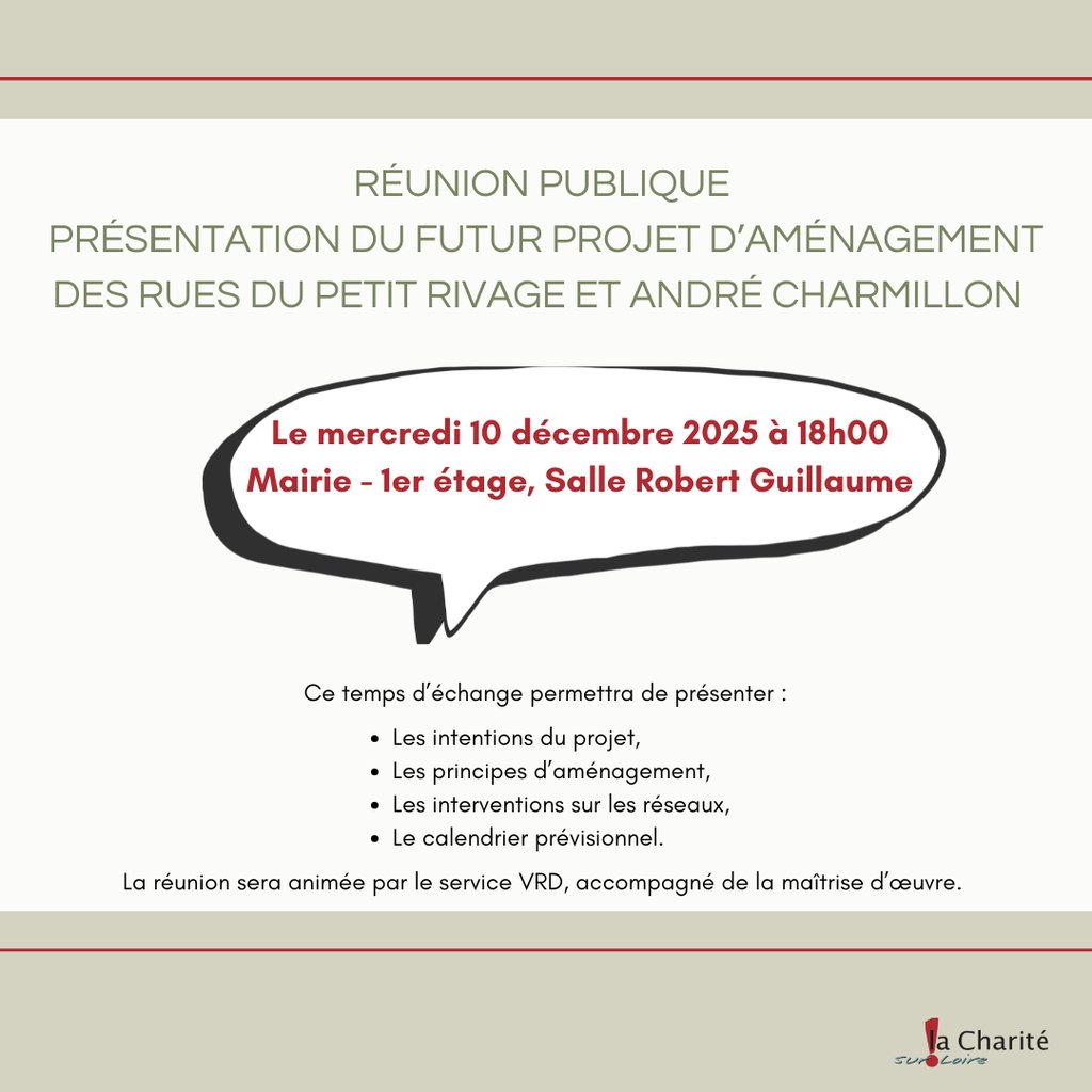 La Ville de La Charité-sur-Loire invite les habitants à une réunion publique de présentation du futur projet d’aménagement des rues du Petit Rivage et André Charmillon.