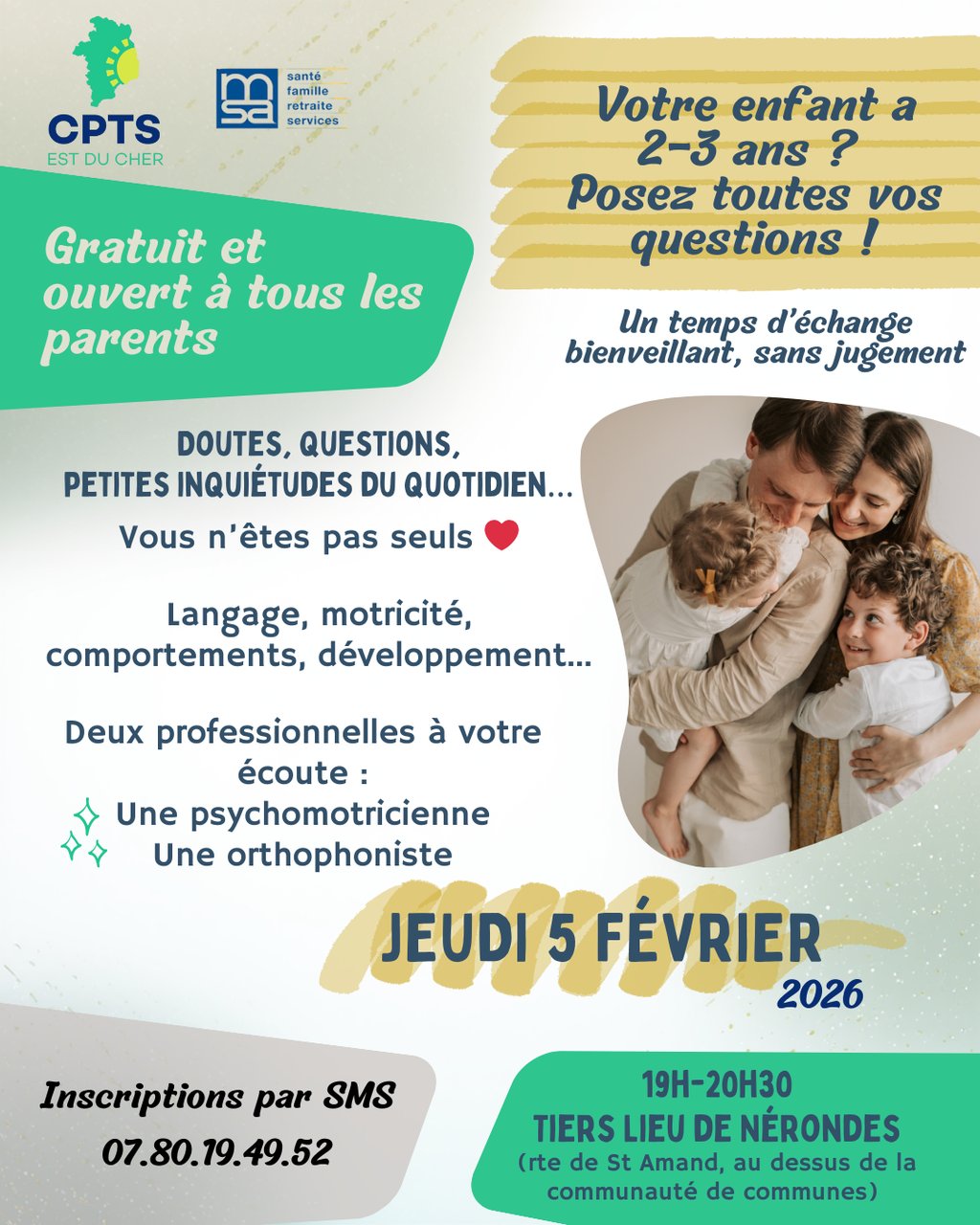 La CPTS de l’Est du Cher organise prochainement un atelier à destination des parents d’enfants de 2–3 ans, animé par une psychomotricienne et une orthophoniste.