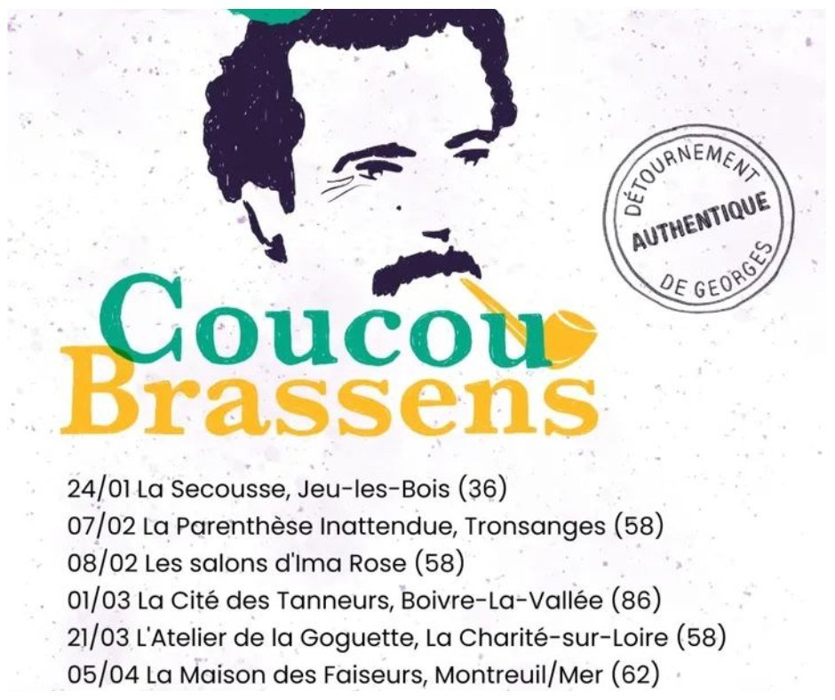 Pom pom pom pom... Nouveau spectacle ! J'ai pris les chansons de Georges, je les ai mises dans ma guitare, je les ai tourneboulées, et hop ! Voici "Coucou Brassens". Rendez-vous samedi 7 fevrier au restaurant la parenthèse inattendue à tronsanges