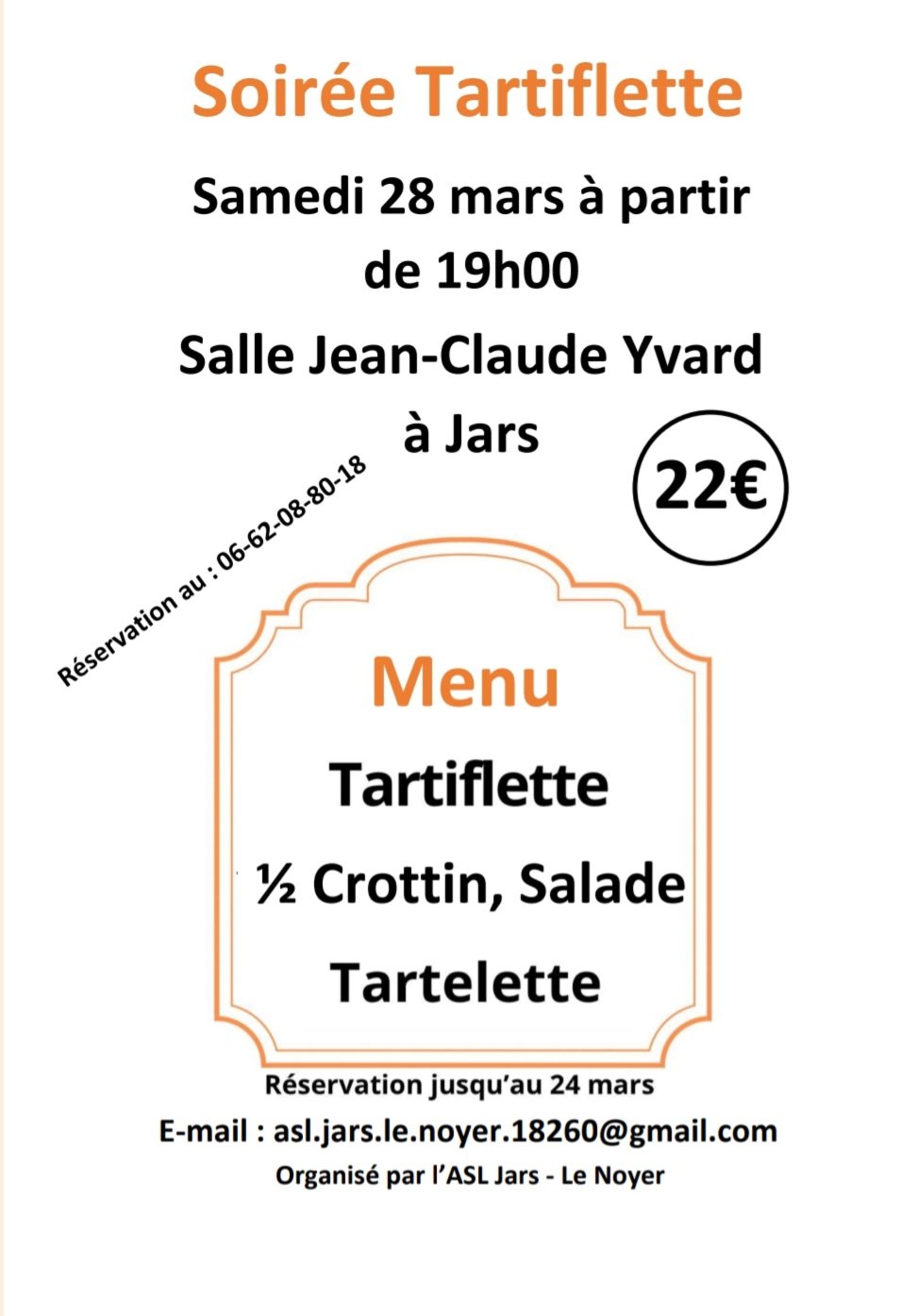 L'ASL Jars-Le Noyer organise son repas de fin d'hiver le samedi 28 mars à partir de 19h venez nombreux !!!